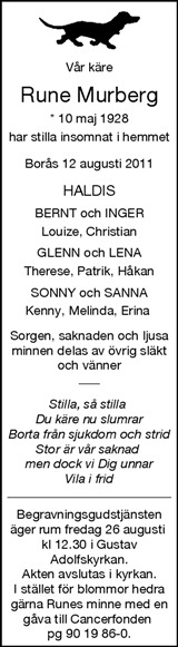 | Begravd | 20110824 Gustav Adolfs kyrkan Borås |